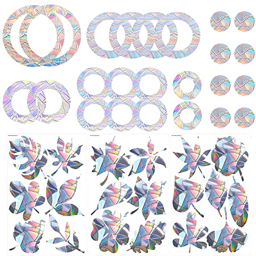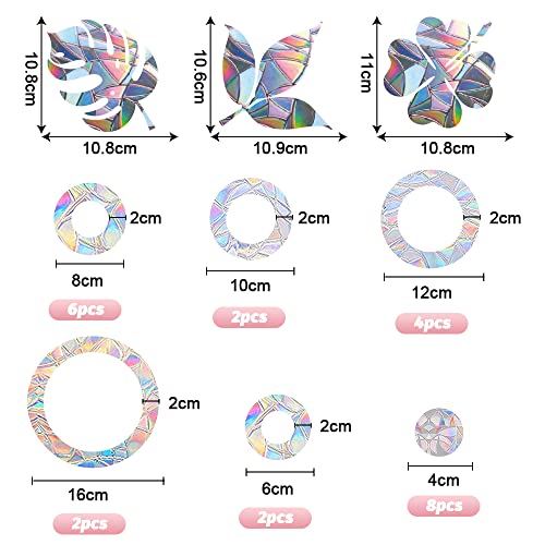 【43 Adesivi anticollisione per uccelli】Questo set di prodotti contiene 43 pezzi di adesivi per finestre anticollisione con motivi riflettenti, dimensioni del cerchio 16 cm, 10 cm, 6 cm (2 ciascuno), 4 pezzi di 12 cm, 6 pezzi di 8 cm, 8 pezzi di 4 cm, larghezza: 2 cm. I righelli del tipo di foglia sono: 10,8*10,8 cm, 10,9*10,6 cm, 10,8*11 cm e ci sono 19 foglie in totale. La quantità è sufficiente per soddisfare le diverse esigenze.
