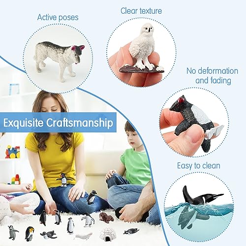 【Set di giocattoli per animali marini da 26 pezzi】Questo set di figurine di animali marini realistici contiene 26 ornamenti di animali con diverse forme di animali: volpe artica, delfino, balena beluga, pinguino, lupo bianco, foca, renna, leopardo delle nevi, lepre artica, husky, balena, orso polare, ecc. Può essere una bellissima esperienza per tuo figlio giocare per ore e ore.