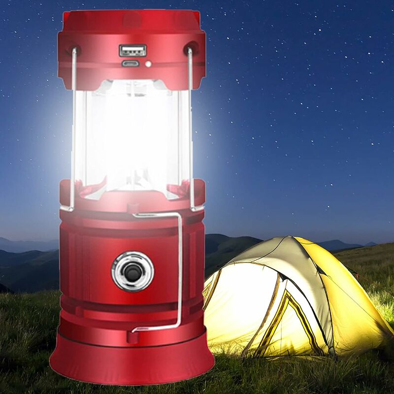 Ricarica solare della batteria USB: la batteria al litio integrata da 1202 mAh consente di caricare la lanterna tramite energia solare, batteria o USB. Funziona con batterie, non c'è bisogno di aspettare qualche ora per la ricarica. In caso di emergenza, puoi anche utilizzare la batteria come fonte di alimentazione per illuminare le luci da campeggio. La lanterna da campeggio può anche essere caricata come power bank tramite la porta USB dei tuoi telefoni o altri dispositivi 3 modi di utilizzo: ci sono tre modi per utilizzare la luce LED super luminosa. Puoi mettere la lampada da campeggio nel campo come fonte di luce quando sei sul campo e puoi portarla in mano per illuminare tutti durante le attività. La luce da campeggio è progettata per essere portatile e compatta. Puoi anche utilizzare il LED inferiore come torcia per soddisfare tutte le tue esigenze Facile da usare: questa lanterna si accende tirando verso l'alto e si spegne premendo verso il basso, nessun pulsante necessario