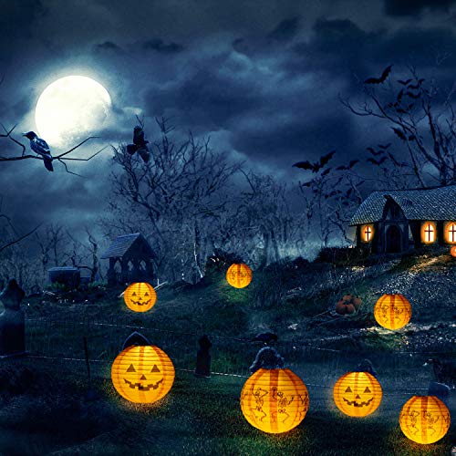 Le nostre lanterne di carta rotonde di Halloween sono dotate di 2 luci a LED bianche calde. La luce può durare almeno 30 ore. Puoi appendere le luci delle lanterne delle zucche ovunque con kit di illuminazione e corde per creare un'atmosfera spettrale per la tua festa di festa e dolcetto o scherzetto.