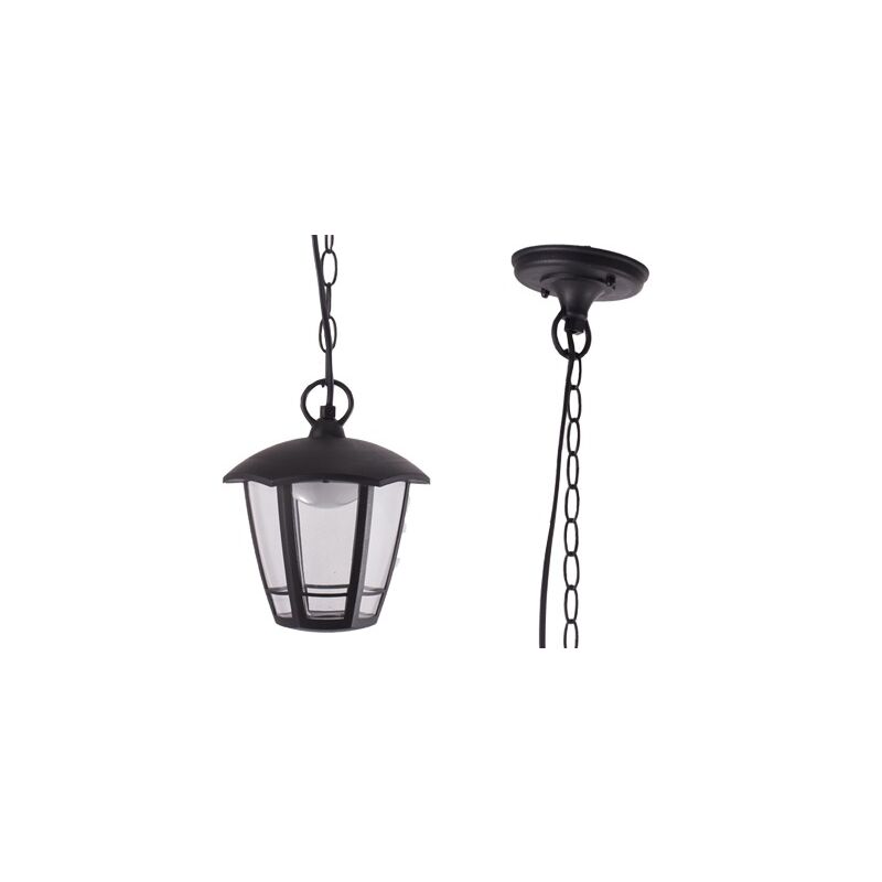 Corpo in polipropilene colore nero, schermo di protezione in policarbonato trasparente a 6 facce. 400 lumen - 8 watt. certificazioni ip44. dimensioni 17xh84 cm. (con catena)