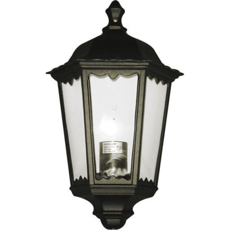 In alluminio pressofuso nero finitura opaca. Schermo in vetro. 3 facce. Attacco E27 - IP44. Dimensioni 22 x 26 x H 44 cm.