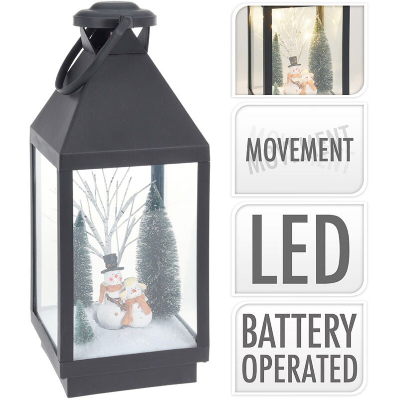 Lanterna con scena natalizia a luce mobile, luce led calda. 18,8x48 cm (larghezza/altezza) con scena del pupazzo di neve. 3xaa non incluso e con timer.