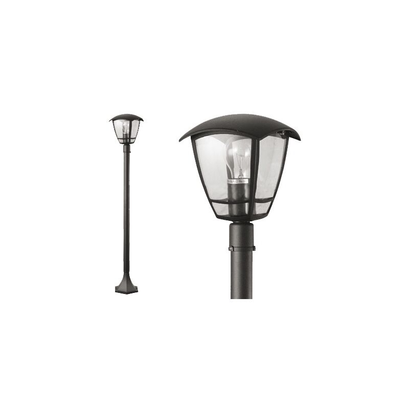 Corpo in alluminio pressofuso colore nero, schermo di protezione in policarbonato trasparente a 4 facce, attacco e27. certificazioni ip44. dimensioni 16x16xh100 cm.