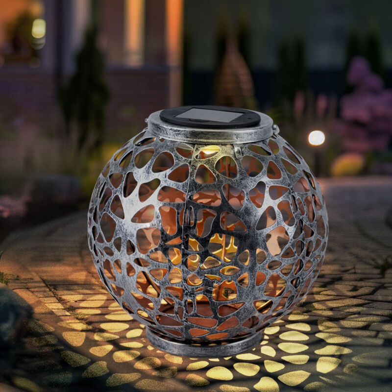 Descrizione Questa lampada solare in metallo color argento arricchisce il tuo giardino con il suo bellissimo design. Puoi posizionare la lampada su un tavolo o appenderla. Il pezzo forte è il paralume, che ha la forma di una palla con la sua treccia decorativa. La luce bianca calda illumina l'area esterna fino a 6-8 ore. Grazie al livello di protezione IP44, questa lampada solare è ideale per l'uso esterno. La sorgente luminosa a LED è installata in modo permanente nella lampada. Lampada dettagli • Tipo di luce: luce solare • Materiale: metallo • Colore: argento, antico • Grado di protezione: IP44 • Batteria inclusa: sì • Tempo di illuminazione: circa 6-8 ore • Diametro x altezza in cm: 20 x 29 • Sorgente luminosa: 1x LED • Lampade installate permanentemente • Colore della luce: bianco caldo • Voltaggio: 3V