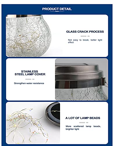 [LUCE DA GIARDINO SOLARE ESTERNO IP65 IMPERMEABILE]: le coperture per barattoli sono il nostro design speciale per l'impermeabilità. L'anello di gomma avvolge completamente l'interruttore, migliora le prestazioni di tenuta dell'interruttore per evitare che la pioggia entri. Le lanterne da esterno con barattoli di vetro craquelé sono realizzate con coperchi in acciaio inossidabile e robusto vetro screpolato che non arrugginisce.