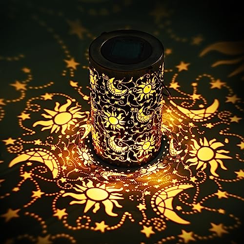 【Splendido design】Le deliziose lanterne solari da esterno emettono un tenue bagliore giallo durante la notte e sono dotate di un design a stella di luna e di sole cavo, che proiettano un bel motivo e creano calore. La finitura antica la rende più unica con senso estetico. Aggiungono un'atmosfera calda e piacevole al vostro cortile e alla vostra terrazza.