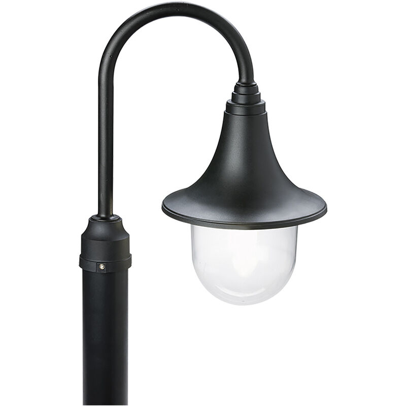 Struttura in termoplastico, diffusore in termoplastico trasparente. Parabola riflettente in alluminio. Adatta per lampade ad incandescenza e a risparmio energetico. Attacco E27, IP43. Attacco a colonna da Ø 60 mm. Solo corpo lanterna, palo optional.