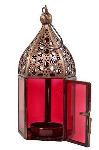 Lanterna a Vento, Lanterna da Giardino, Lanterna in Ferro, Orientale, Marocchino, Arabo Mediterraneo, Marocco - Meena Rosso 16cm - per Le Candele