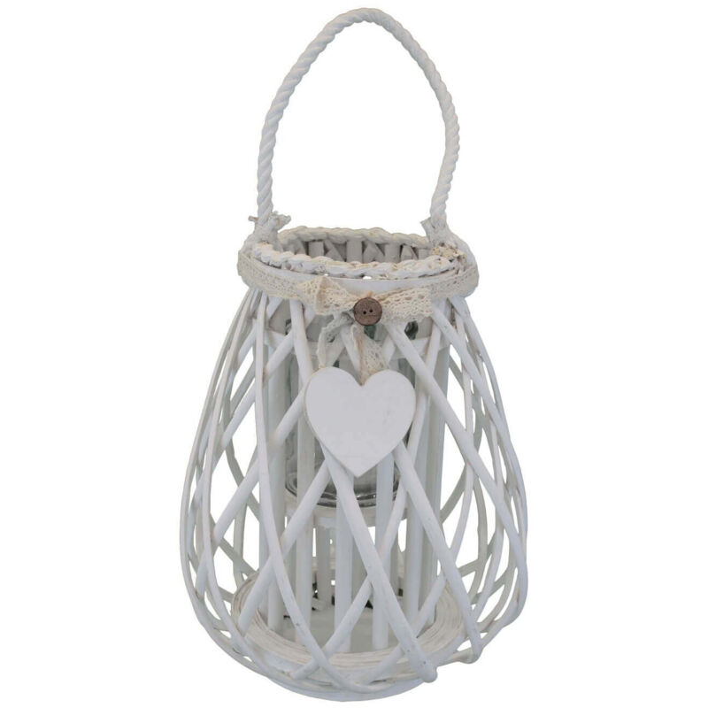 Lanterna bianca in vimini e vetro con nastro in pizzo e decoro a cuore Dimensioni: cm top ø 15 x 25 h-centrale ø 23 x 25 h-vetro ø 10 x 15 h Porta un tocco di calore rustico e ospitale nella tua casa con la nostra lanterna TREV. Questa lanterna a goccia di lusso è realizzata con del vimini naturale eco-friendly e ha una finitura bianca per un look romantico alla moda. Il portacandele protettivo in vetro è perfetto per diffondere una luce calda e ovattata. Basta inserire una delle tue candele profumate preferite per creare un'atmosfera istantaneamente rilassante. Ma questa lanterna non è solo bella da vedere, è anche incredibilmente pratica. Un robusto manico in corda di iuta nella parte superiore ti permette di appendere la lanterna su un gancio o una staffa, mentre la base piatta è perfetta per metterla in mostra su uno scaffale o un tavolo. Che tu voglia creare un'atmosfera magica nel tuo salotto o rendere il tuo giardino ancora più affascinante, questa lanterna è la scelta ideale.