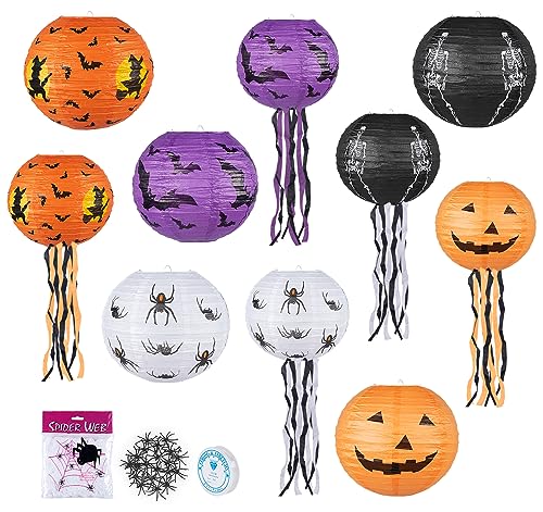10 Lanterne di Carta Per Halloween,2 Taglie Lanterna di Halloween,Halloween Carta Lanterne + 50g Ragnatela Halloween + 20 Ragni,Cinesi Lanterna di Carta di Halloween Carta Appende Pieghevoli(8”+10”)