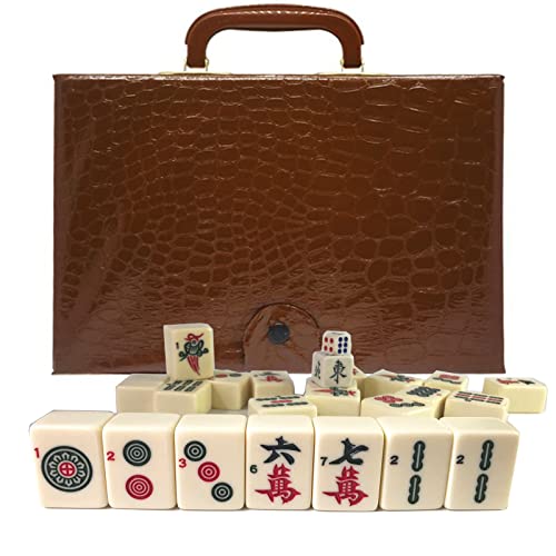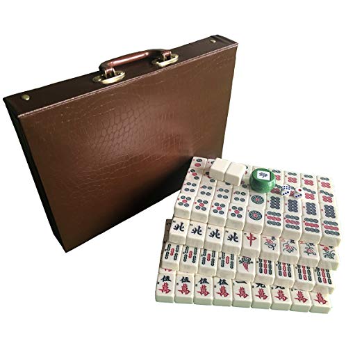 Dettagli del prodotto: questo set di mahjong cinese include 144 piastrelle da 3,6 x 2,8 x 2 cm, 2 piastrelle di ricambio, 2 dadi, un indicatore di scommettitore/vento e una custodia da viaggio marrone.