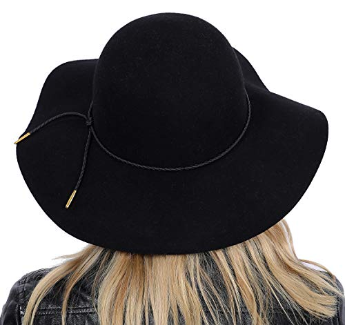 Lanzom Cappello Fedora di lana di lana del cappello di Panama della cinghia della signora del retro dell'ampia tesa delle donne, A-black, Taglia unica