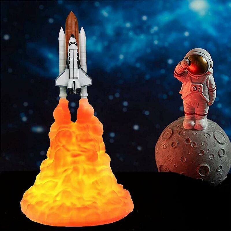 Lampada da notte con lampada spaziale - 2021 Nuova luce notturna con lampada dello space shuttle per la stampa 3D, forma realistica del lancio del razzo, la superficie della lampada del razzo è molto vicina alla scena del lancio del razzo, hai quindi la sensazione di essere dentro è anche una buona decorazione Stampa 3D, la materia prima PLA è ottenuta da risorse vegetali rinnovabili, completamente degradata sotto i microbi del suolo, rispettosa dell'ambiente, sicura e rispettosa dell'ambiente, innocua per il corpo umano. prima dell'uso. È anche una bella luce notturna nell'illuminazione (rosso arancio chiaro, leggera differenza di colore). L'interruttore a un pulsante può cambiare la luminosità della luce dello space shuttle da fioca a luminosa. Batteria da 800 mAh, completamente carica dopo 1-2 ore, ha una durata di 8-10 ore, colori e modalità multiple che cambiano colore e si adattano alla tua giornata. . L'apparecchio a sospensione con LED nella parte nuvola che genera luce calda.