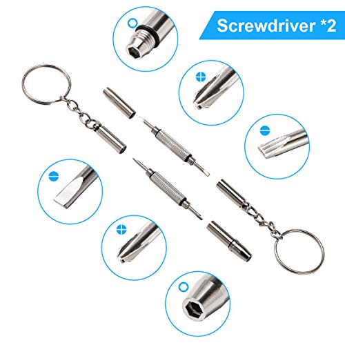 Semplice e conveniente: dadi e rondelle sono memorizzati in una scatola di immagazzinaggio, in modo da poter facilmente trovare nel set di riparare gli occhiali, ed evitare la perdita, se necessario. Per evitare confusione, vedere la pagina degli adesivi con le informazioni sulle dimensioni.Usare le pinzette coveniente e cacciavite magnetico con etichetta portachiavi portatile, si può facilmente appenderlo per ottenere il lavoro in modo efficiente.