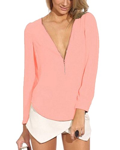 LaoZan Donna Manica Lunga Chiffon Scollo V Camicetta con Cerniera Camicia Tops T-Shirt Pink XL