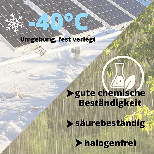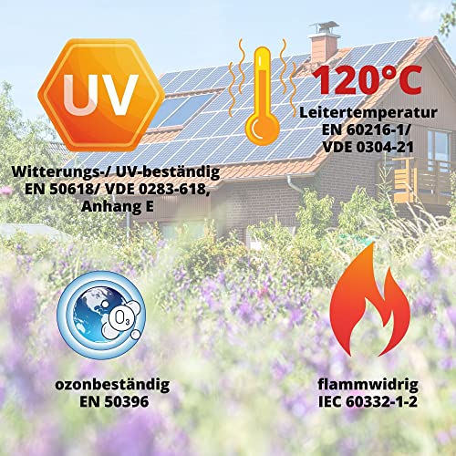 A norma DIN EN 50618 si applica: previsto per l'uso in impianti PV ad esempio B. secondo HD 60364-7-712. Possono essere utilizzati sia all'esterno che all'interno in caso di posa libera e fissa e appesi liberamente. Posa anche in tubi di installazione elettrici, canali, intonaco e nelle attrezzature. Adatto per l'uso in dispositivi e impianti isolati (classe di protezione II). Sono a prova di cortocircuito e di terra, secondo HD 60364-5-52.
