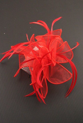 Large Red looped fabric and Feather Fascinator on a clear comb. by Mias Accessories