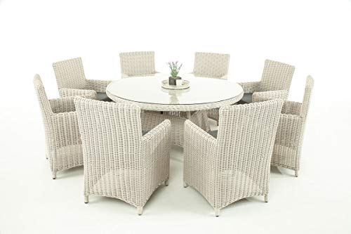 Dimensioni approssimative: Dimensioni: diametro tavolo: 150 cm, altezza: 74,5 cm, spessore piano in vetro: 5 mm, altezza sedia: 91 cm, larghezza: 59 cm, profondità: 60 cm, altezza seduta: 44 cm Cuscino da seduta da 8 cm, seduta (larghezza x profondità): 47 x 47 cm, larghezza bracciolo: 6 cm