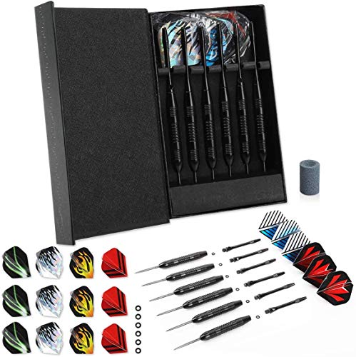 LARRITS 6 PACK 23 GRAMS STEEL TIP DARTS SET: 6 pcs darts + 9 pcs standard flights+ 9 pcs laser flights + 12 pcs rubber rings + 1 pcs darts sharpener + 1 pcs package box
