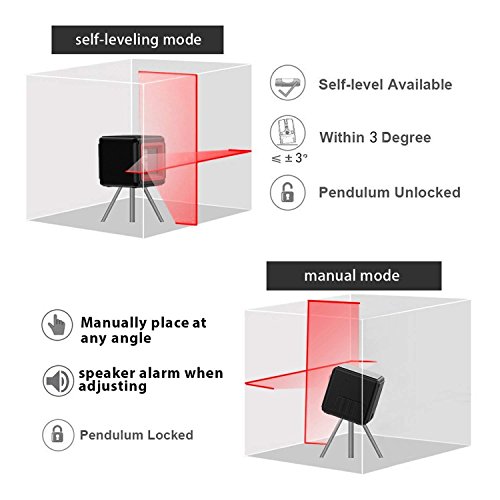 【 Pennello selettivo & 2 modalità selezionabili 】: la modalità autolivellante è disponibile in un intervallo di inclinazione di 3°. Quando si è fuori del campo (+/- 3°) per autolivellamento, il parlante inizierà a farsi sentire. È possibile regolare il blocco manuale del pendolo se il dispositivo deve essere allineato in modo autonomo o lo specchio laser deve essere fissato.