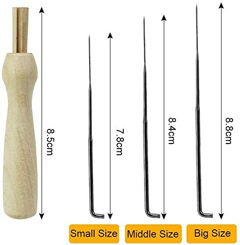 [Kit aghi per feltro] Il pacchetto include aghi in feltro da 75 pezzi 3 dimensioni (L: 9,1 cm / M: 8,6 cm / S: 7,9 cm), 25 pezzi di ogni dimensione e supporto dell'ago in legno da 3 pezzi, tubi in plastica da 3 pezzi, protezioni per le dita in pelle da 2 pezzi