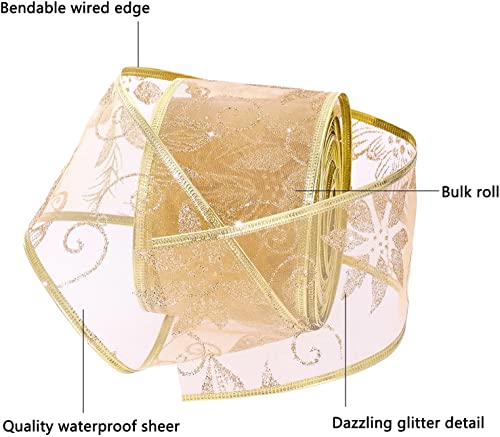 LATERN 20M Nastro Di Organza, Larghezza 6,3CM Fiocco Di Neve Wired Sheer Glitter Ribbon Nastri Metallizzati Con Fascia Luccicante Nastro Di Tulle Artigianale per Decorazione Natalizia (Oro)