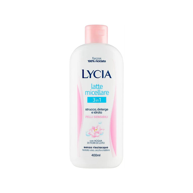Lycia latte micellare pelli sensibili 400 ml. Latte micellare indicato per la detersione di pelli sensibili. La formula cremosa latte è arricchita con Acido Ialuronico e Acqua di fiori di loto che donano un piacevole effetto idratante sul viso ed emolliente sulle labbra.