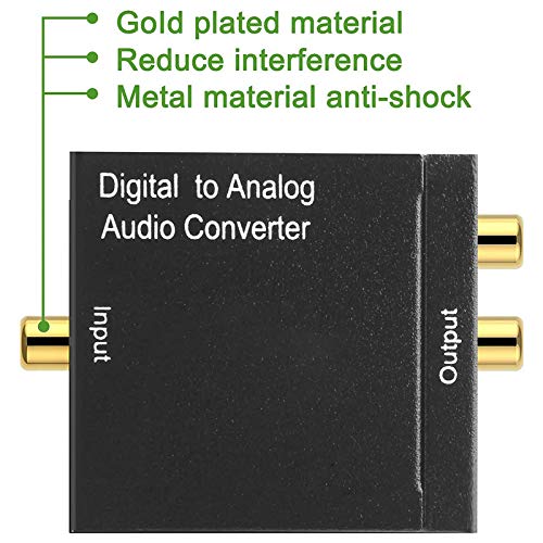 l'uscita coassiale ottica o digitale di HDTV, TV Box e altri dispositivi questo convertitore audio digitale ad analogico, quindi RCA L/R o uscita da 3,5 mm sull' lato la cuffia o l'altoparlante stereo. Non è necessario alcun interruttore, basta plug and play, rileverà automaticamente il segnale audio per funzionare immediatamente. Inoltre, questo convertitore DAC è di dimensioni compatte, facile da trasportare, commutazione audio o professionale.