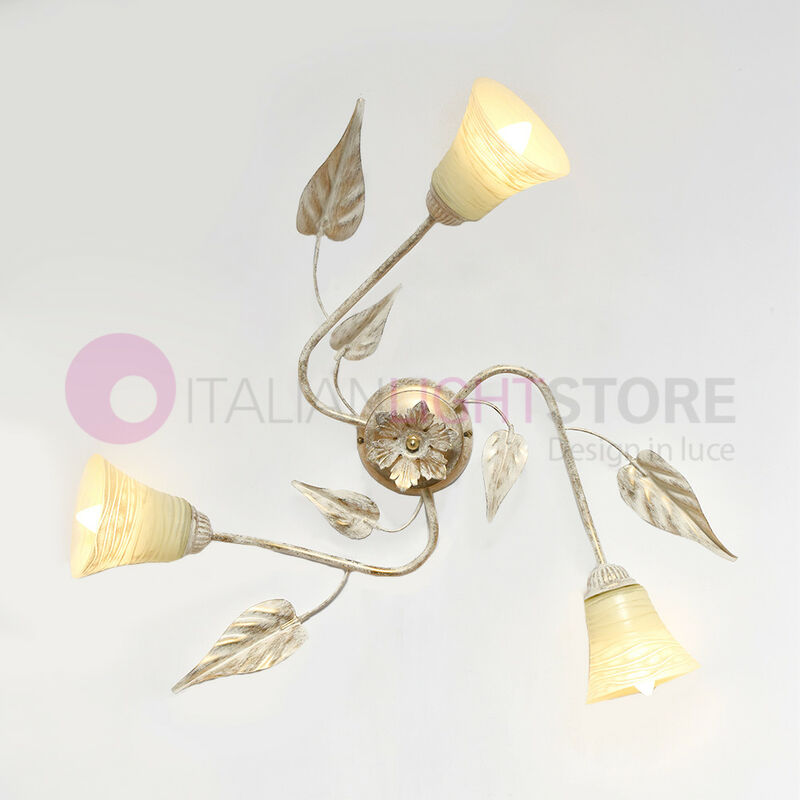 Lampada da soffitto in stile rustico floreale, realizzata in ferro sagomato e decorato a mano AVORIO-ORO. Plafoniera lampadario da soffitto a 3 braccia in stile classico rustico, con struttura in ferro battuto sagomato a mano, abbellito con delle foglie e decorato artigianalmente in AVORIO-ORO;