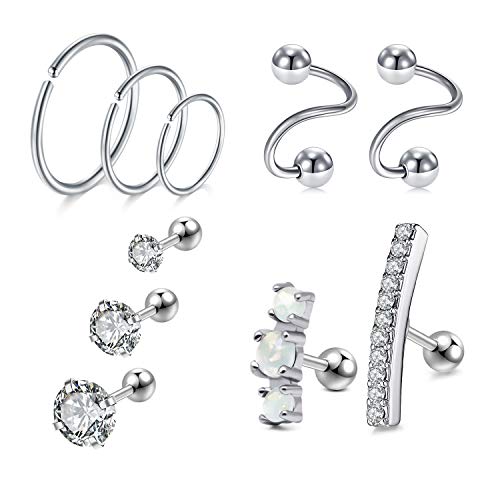 LAURITAMI 10PCS Orecchini a Piercing Helix Perno 16G Argento Anelli Cerchio Cartilagine in Acciaio Chirurgico Tragus CZ Gioielli