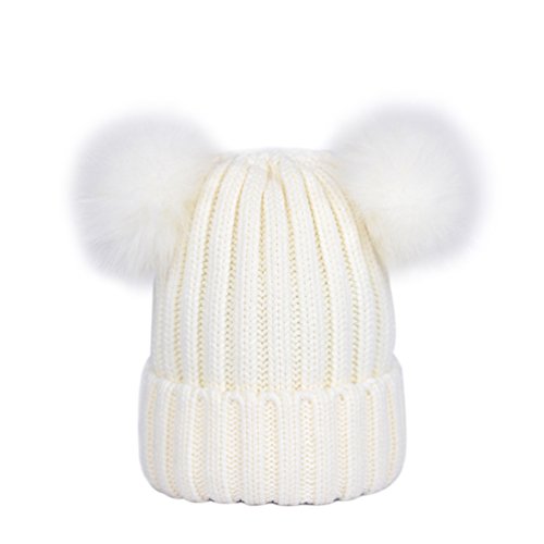 LAUSONS Berretti invernali da donna cappelli in maglia berretto a coste con doppio pompon in pelliccia sintetica rimovibile Blanc