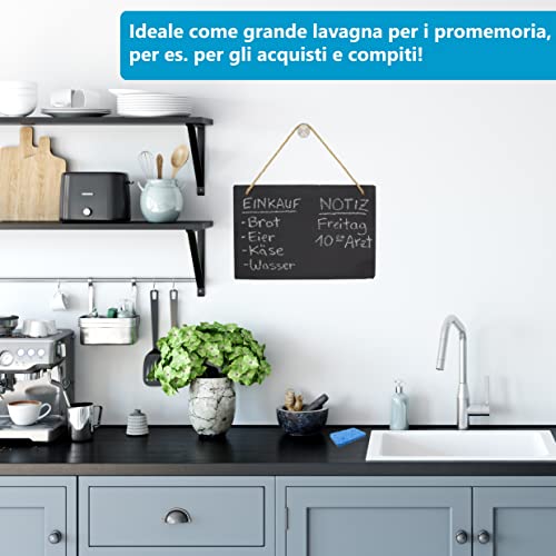 Lavagna di ardesia su cui scrivere e da appendere incl. gesso e spugna - Lavagna su cui scrivere con gesso, dotata di corda naturale, in formato orizzontale 30 x 20 cm per annotazioni e altro.
