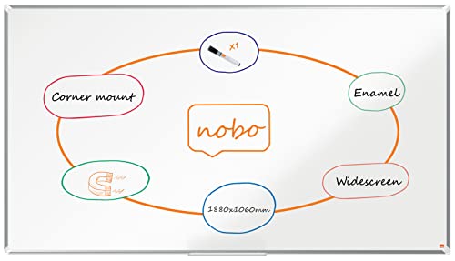 Nobo Lavagna Bianca Magnetica Smaltata Widescreen, 1880 x 1060 mm, Cornice in Alluminio, Sistema di Montaggio ad Angolo, Incl. Vaschetta Porta Accessori, Gamma Premium Plus, Bianco, 1915369