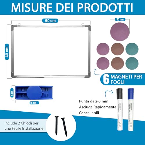 Lavagna Magnetica Bianca Cancellabile Con Cornice In Alluminio Di 60x40 Cm Ideale Per Ufficio, Casa, Scuola Con Set Di Accessori: 2 Pennarelli (Nero E Blu) + Cancelino + 6 Magneti Colorati + 2 Chiodi.