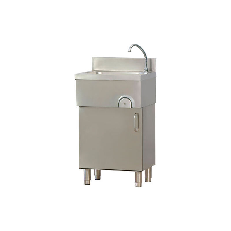 Codice RS1360 - Lavamani in acciaio inox, modello FO-LMM, dimensioni cm. 50x40x85 (lxpxh). Lavamani su mobile con porta a battente, comando a ginocchio. Predisposto per allacciamento acqua calda o fredda.