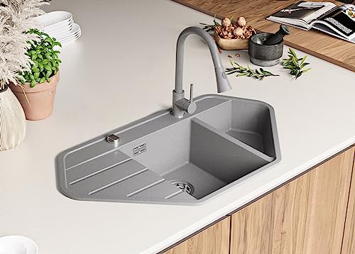 Lavandino Cucina Angolare 90 x 50 cm, Lavello in Granito 1,5 vasche + Miscelatore Cucina + Sifone Classico, Lavabo Cucina Incasso Copenhagen Corner di Primagran, Grigio