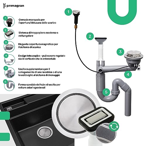Lavandino Cucina 58 x 53 cm, Lavello Composito 1 vasca + Sifone Automatico, Lavabo Cucina Incasso Oslo 60 Pocket di Primagran, Grafite
