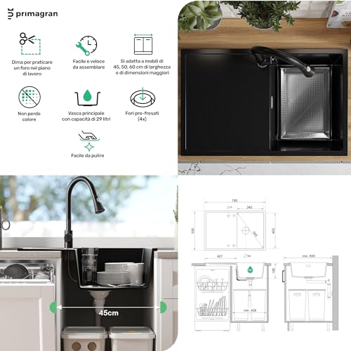 Lavandino Cucina 78 x 50 cm, Lavello Composito 1 vasca + Sifone Automatico, Lavabo Cucina Incasso Ibiza di Primagran, Grafite