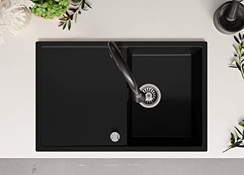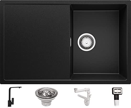 Lavandino Cucina 78 x 50 cm, Lavello in Granito 1 vasca + Miscelatore Cucina + Sifone Classico, Lavabo Cucina Incasso Ibiza di Primagran, Nero