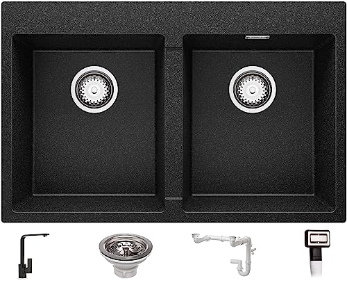 Lavandino Cucina 78 x 50 cm, Lavello in Granito 2 vasche + Miscelatore Cucina + Sifone Classico, Lavabo Cucina Incasso Oslo 80 Twin di Primagran, Grafite