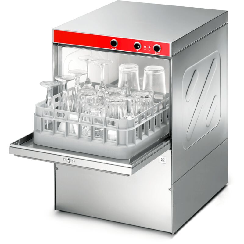Dimensioni esterne (LxPxH) 460x521x670 cestello (mm) 400×400 altezza utile (mm) 280 peso netto (Kg) 37 alimentazione elettrica 230 V - 50 Hz durata cicli di lavaggio (sec) 90/120 produzione teorica (cestelli/ora) 30/40 consumo acqua di risciacquo (l) 2,5 resistenza vasca (kW) 2 resistenza boiler (kW) 2,8 pompa di lavaggio (kW) 0,26 potenza installata (kW) 3,06 capacità vasca (l) 12,5Caratteristiche Pannello comandi con pulsanti elettromeccanici 2 cicli di lavaggio Porta doppia parete Mulinelli di lavaggio e risciacquo superiori e inferiori facilmente estraibili Dispositivo di sicurezza Termostop per garantire la temperatura di risciacquo Facile accesso ai componenti per agevolare l'attività di assistenza Vasca stampata Resistenza controllata da termostato Pannellatura posteriore Dotazione standard Cestello universale per bicchieri Cestello per posate Cavo di alimentazione elettrica, tubo di alimentazione idrica e scarico flessibili.