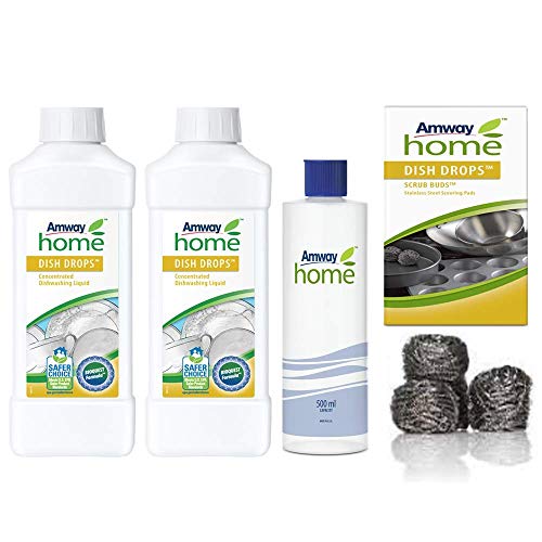 Lavastoviglie liquido concentrato biodregadable Dish Drops 1L x 2UNDS + 4 spugnette abrasive in acciaio inox Scrub budstm Dish Drops+Flacone dispensatore AMWAY HOME