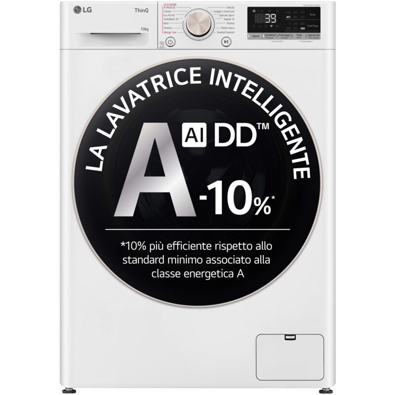 Lavatrice Libera Installazione Carica Frontale AI DD 10 Kg Classe A-10% TurboWash 360 Vapore su 7 programmi 1400 giri/min. Wi-Fi Serie R7 LG F4R7010TSWG Caratteristiche principali Risparmia più energia: la nostra lavatrice è il 10%* più efficiente rispetto a quelle tradizionali in classe A Extra capacità: lava fino a 11kg di bucato in soli 56,5cm di profondità Tecnologia AI DD™: l'Intelligenza Artificiale riconosce i tessuti e sceglie il lavaggio più appropriato fra 20.000 combinazioni, prendendosi cura dei tuoi capi TurboWash 360: 4 getti di acqua con effetto doccia 3D per un pulito profondo in soli 39 minuti Lavaggio a vapore Steam™: attiva il vapore su 7 programmi per igienizzare i capi, eliminando germi, batteri e allergeni Wi-Fi: gestisci la lavatrice da remoto utilizzando l'app ThinQ o l'assistente vocale Google Ti fa risparmiare Consuma il 10% in meno dello standard minimo in classe A Riconosce i tessuti per lavarli meglio La nostra lavatrice è il 10%* più efficiente rispetto a