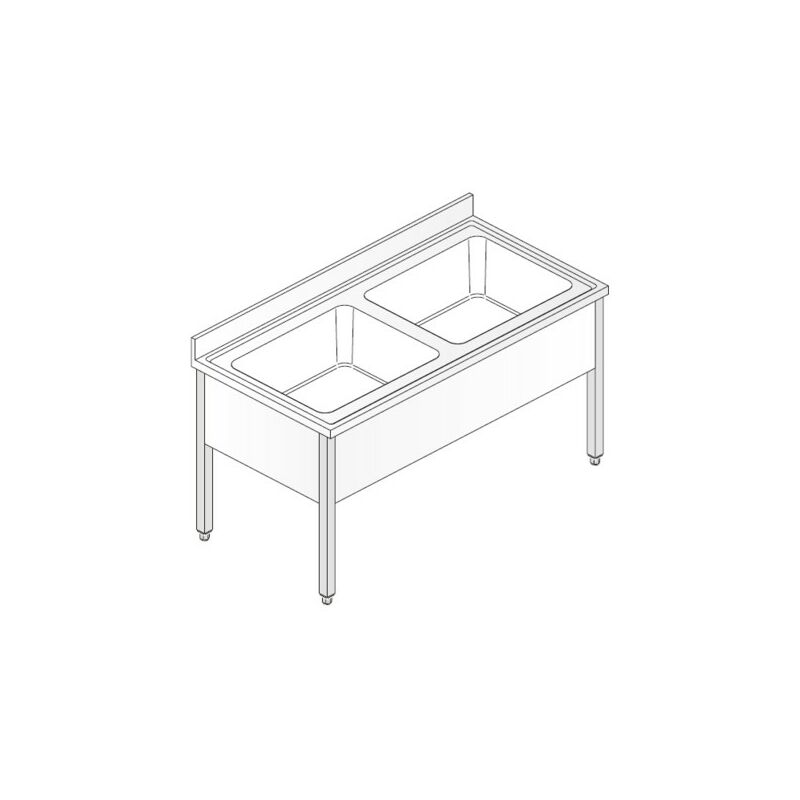 Codice RS5561 - Lavello lavatoio su gambe, modello AC-SM/LT/SR/120/2V/6, costruito in acciaio inox 18/10 AISI 304 (no 430), dimensioni cm. 120x60x85 (lxpxh), n.2 vasche dim. cm. 50x40x25 (lxpxh). Vasca stampata spessore 1 mm, piano con spessore 40 mm, alzatina posteriore spessore 20 mm e altezza 100 mm. Gambe con profilo quadrato 40x40 mm con piedini regolabili in altezza. Fornito in kit smontato. In dotazione: piletta di scarico d. 46 mm e tubo troppo pieno.