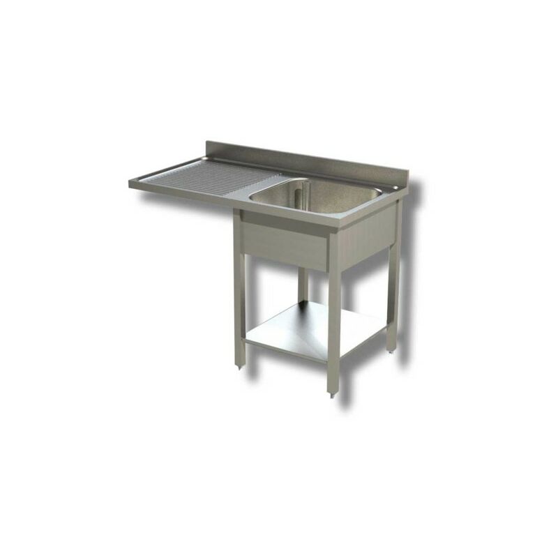 Codice RS4978 - Lavello lavatoio su gambe e piano di fondo, modello RP-DSLGLSX147, costruito in acciaio inox 430, dimensioni cm. 140x70x85 (lxpxh), n.1 vasca dim. cm. 60x50x30 (lxpxh), sgocciolatoio SX, vano lavastoviglie. Vasca stampata spessore 1 mm, piano con spessore 40 mm, alzatina posteriore spessore 20 mm e altezza 100 mm. Gambe con profilo quadrato 40x40 mm con piedini regolabili in altezza. Fornito in kit smontato. In dotazione: piletta di scarico d. 46 mm e tubo troppo pieno.