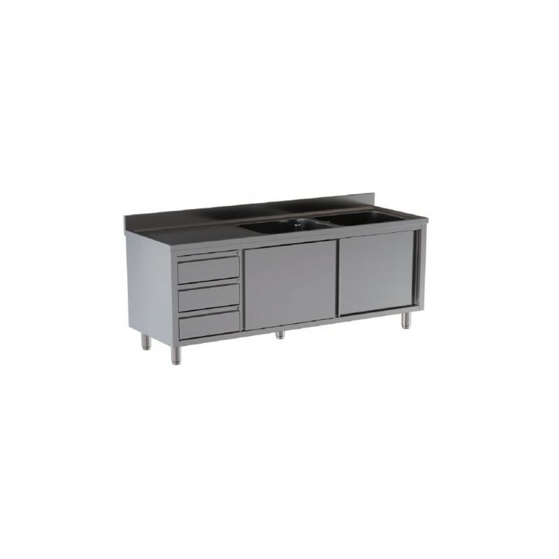 Codice RS9738 - Lavello lavatoio armadiato, modello RP-DSLA2VGS3CSX157, costruito in acciaio inox 430, antine scorrevoli, 3 cassetti, dimensioni cm. 150x70x85 (lxpxh), n.2 vasche dim. cm. 40x40x30 (lxpxh), sgocciolatoio SX. Vasca stampata spessore 1 mm, piano con spessore 40 mm, alzatina posteriore spessore 20 mm e altezza 100 mm. Piedini regolabili in altezza. In dotazione: piletta di scarico d. 46 mm e tubo troppo pieno.