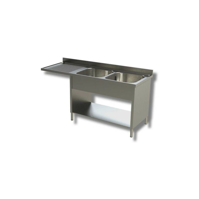 Codice RS5008 - Lavello lavatoio su fianchi e piano di fondo, modello RP-DSLF2VLSX167, costruito in acciaio inox 430, dimensioni cm. 160x70x85 (lxpxh), n.2 vasche dim. cm. 40x50x30 (lxpxh), sgocciolatoio SX, vano lavastoviglie. Vasca stampata spessore 1 mm, piano con spessore 40 mm, alzatina posteriore spessore 20 mm e altezza 100 mm. Gambe con profilo quadrato 40x40 mm con piedini regolabili in altezza. In dotazione: piletta di scarico d. 46 mm e tubo troppo pieno.
