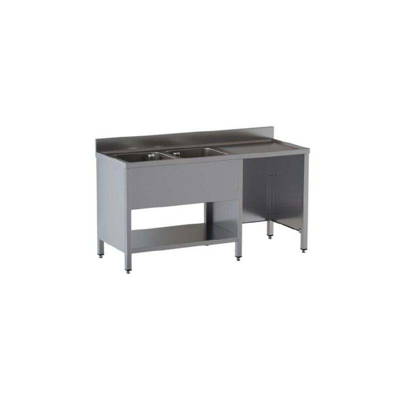Codice RS5062 - Lavello lavatoio su fianchi e piano di fondo, modello RP-DSLF2VPDX167, costruito in acciaio inox 430, dimensioni cm. 160x70x85 (lxpxh), n.2 vasche dim. cm. 40x50x30 (lxpxh), sgocciolatoio DX, vano pattumiera. Vasca stampata spessore 1 mm, piano con spessore 40 mm, alzatina posteriore spessore 20 mm e altezza 100 mm. Gambe con profilo quadrato 40x40 mm con piedini regolabili in altezza. In dotazione: piletta di scarico d. 46 mm e tubo troppo pieno.