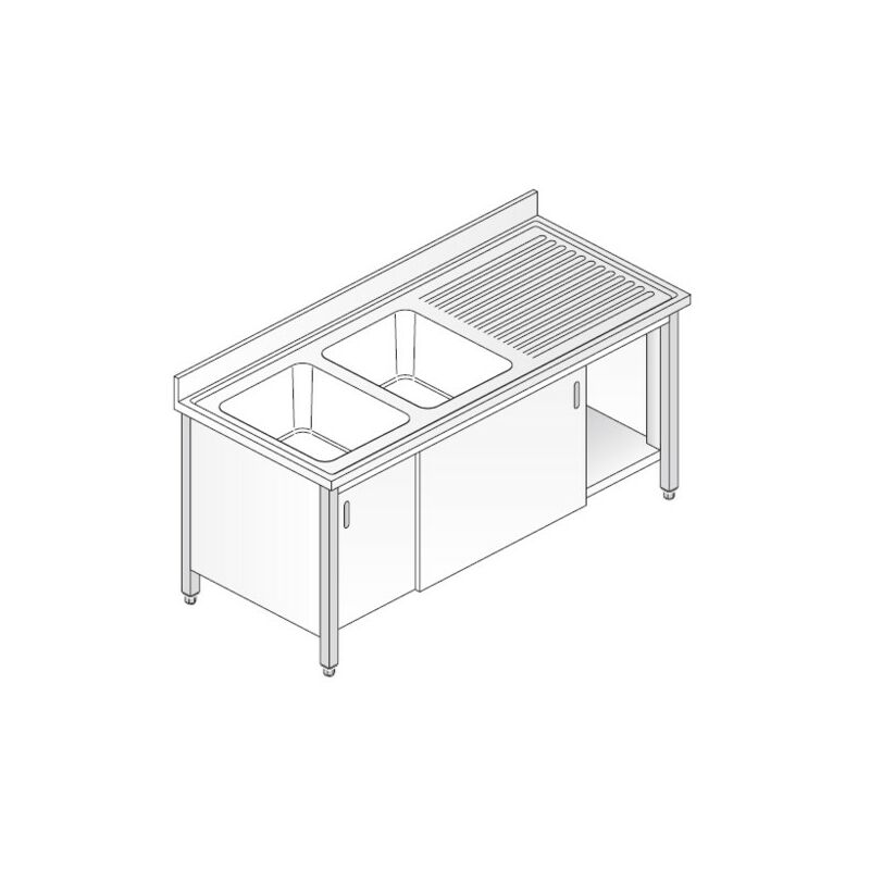Codice RS5475 - Lavello lavatoio armadiato, modello AC-IL/LA/180/2VGDX/6, costruito in acciaio inox 18/10 AISI 304 (no 430), antine scorrevoli tamburate, dimensioni cm. 180x60x85 (lxpxh), n.2 vasche dim. cm. 50x40x25 (lxpxh), sgocciolatoio DX. Vasca stampata spessore 1 mm, piano con spessore 40 mm, alzatina posteriore spessore 20 mm e altezza 100 mm. Piedini regolabili in altezza. In dotazione: piletta di scarico d. 46 mm e tubo troppo pieno.